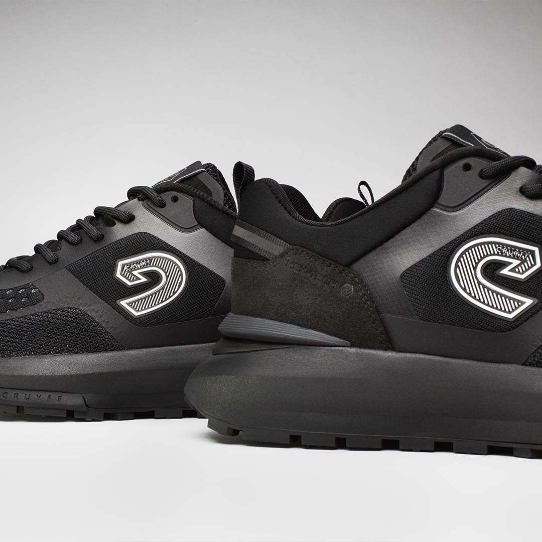 These Cruyff Fuseknit Trainers are the epitome of athleisure fashion. This all-in-black version is keeping the premium high fashion aesthetic the Cruyff brand is known for. Technical uppers and leather accents sit on top of a distinctive, cushioned midsole, finished with an eye-catching wedge heel detail and a chunky outsole. The signature Cruyff branding gives this staple iconic brand recognition and character.