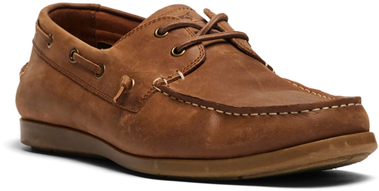 The Gordons Bay boat shoe sits atop an off white or gum coloured rigid rubberoutsole for comfort and wearability. The burnished leather uppers feature aboat shoe design with tonal lacing and eyelet detail and are lined with leatherand canvas for a casual feel. As the upper features elasticated reinforcementacross the tongue, you can remove the laces for a sophisticated look and slipon / slip off functionality.