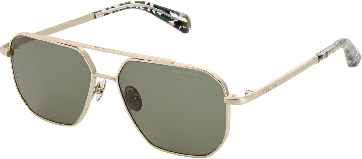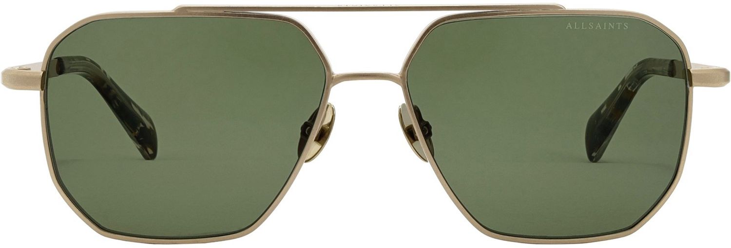 This stylish small metal navigator is brought to you by All Saints. Shown here in a gold finish with complementary acetate temple tips and adjustable nose pads, the green lenses give this sunglass a retro and very stylish twist.