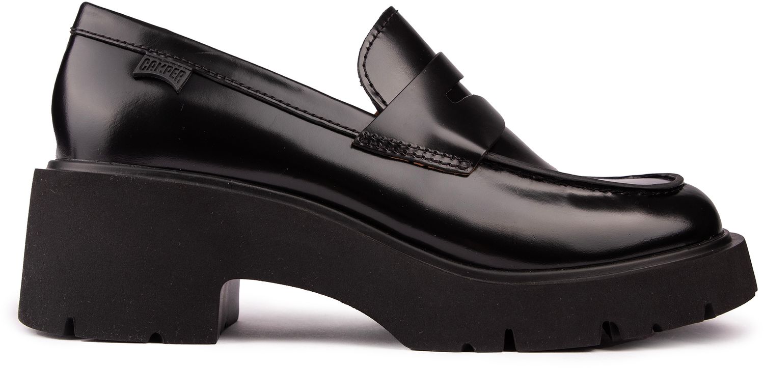 This Milah shoe from Camper is a chunky, sleek loafer with a Penny-Loafer- inspired aesthetic and a distinctive urban look. The everyday but not ordinary style has a chunky outsole for extra attitude, an ortholite®footbed for comfy wear and a polished black leather upper, ready to impress.