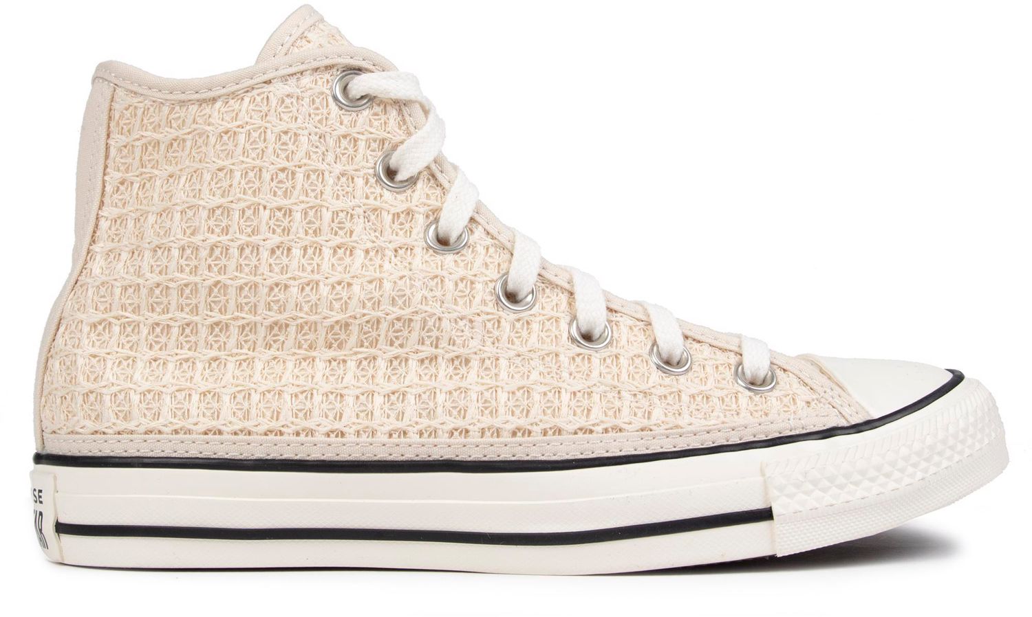 Women's cream Converse Chuck Taylor All Star Hi lace-up trainers with woven textile upper, and iconic rubber toe cap and vulcanised striped rubber sole. These ladies' high-top sneakers feature brushed silver eyelets and are textile lined, finished with classic branding on the side and heel cage.