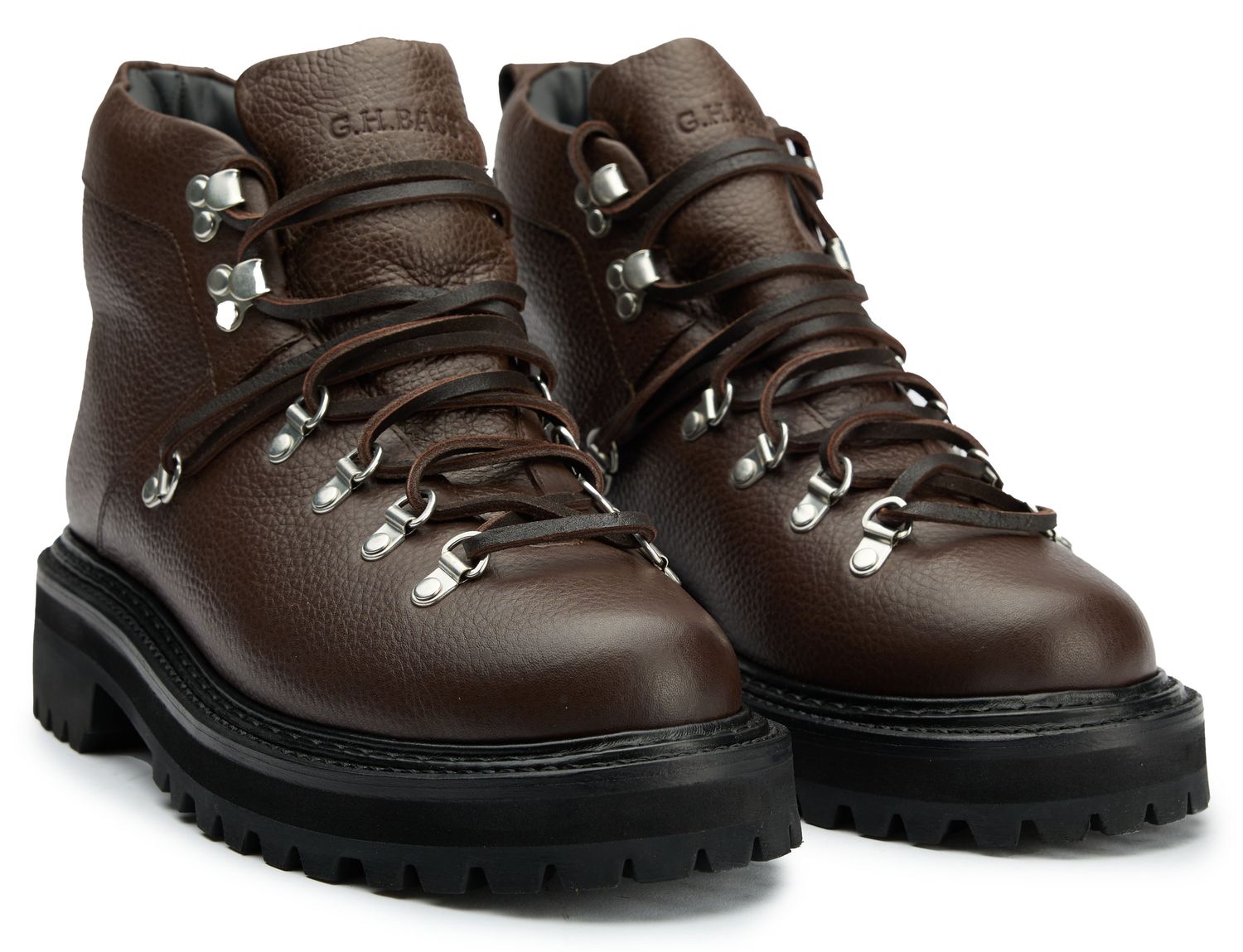 Rugged meets refined in these alpine-inspired ankle boots from G.H.Bass. Rich brown leather uppers showcase meticulous craftsmanship with reinforced welt construction, while the trusted Vibram sole delivers uncompromising grip on any terrain. A cushioned insole ensures day-long comfort, whether you're navigating city streets or mountain trails. Subtle gold foil branding adds the perfect finishing touch to this versatile outdoor essential.