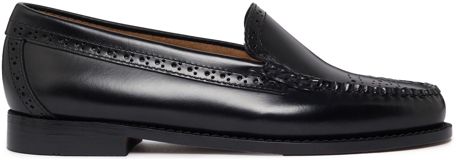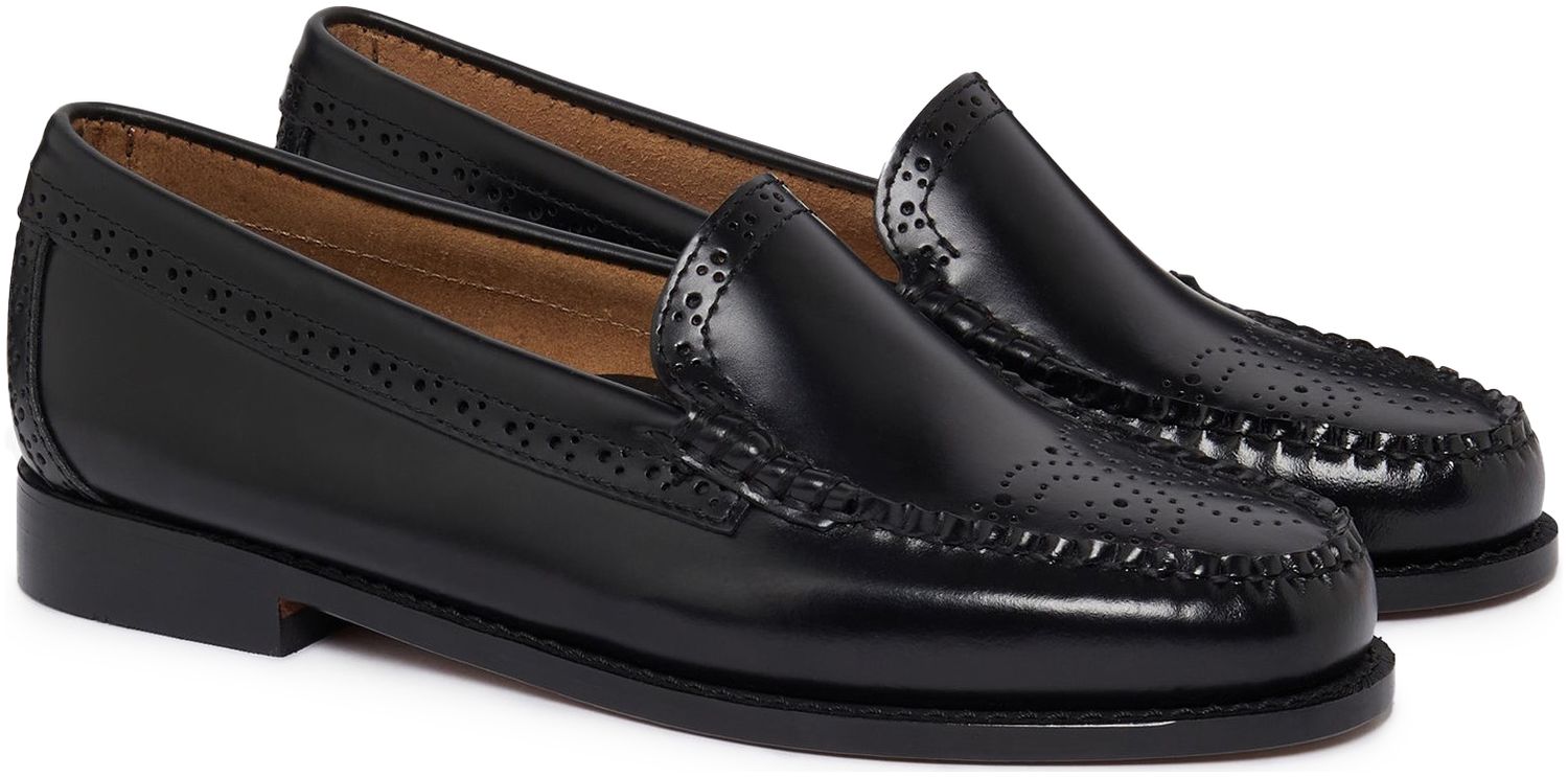 Update your wardrobe with the women's Weejuns Venetian Brogue Loafers in polished black leather. Expertly designed for comfort and style, these Venetian loafers have been updated with floral brogue detailing for a feminine and charming touch. Easy to slip on and off, these loafers feature plush cushioned insoles and an ultra-soft leather insock that promises all-day comfort. The reinforced flat welt stitch, protective rubber heel tap and resoleable leather sole ensure years of durability. Ideal for the office or casual outings, these loafers combine traditional sophistication with modern flair.
