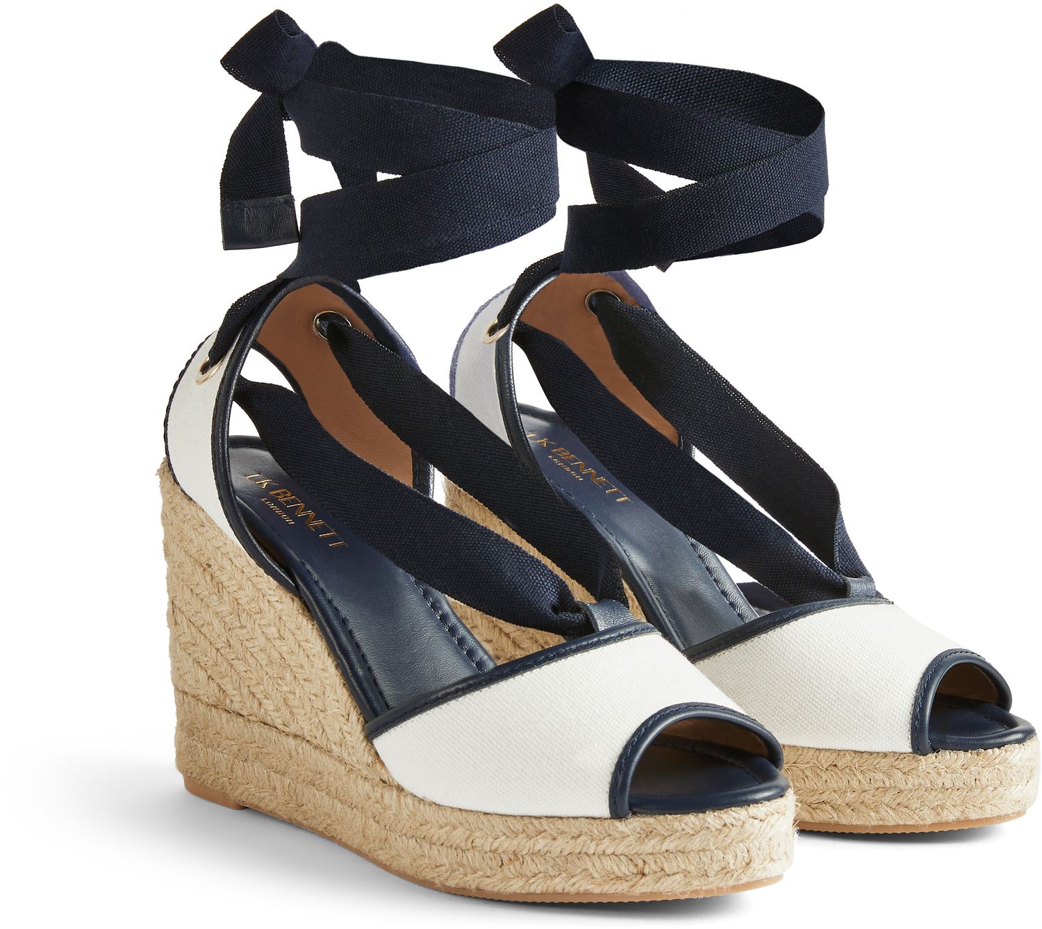 The classic wedge espadrille never falls out of style, it's an essential over the summer months, and the Chiara espadrilles are designed to pull on and go when the sun shines. Crafted in Spain from soft ecru canvas with a midnight blue contrasting border, they're an open-toe style with an espadrille wedge sole, fastening with dark blue cotton ties up the leg. Wear them with cool cotton sun dresses on the warmest of days.