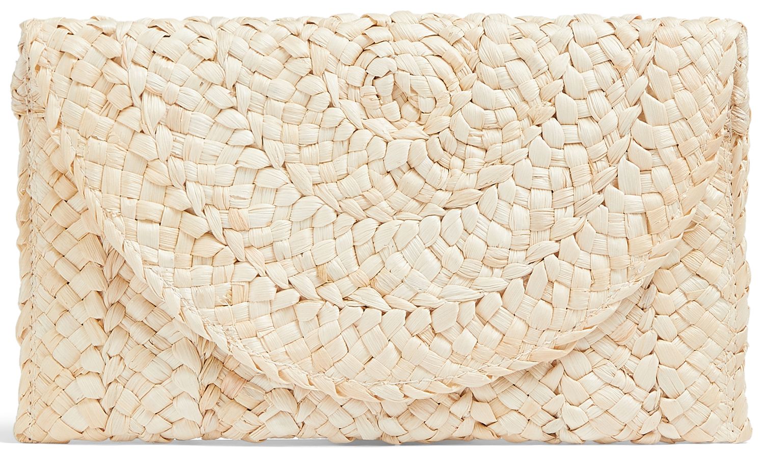 The Dove clutch is crafted from natural straw. It's a slim, envelope style with a curved front that fastens with a popper, and it has a cotton lining with a slip pocket.