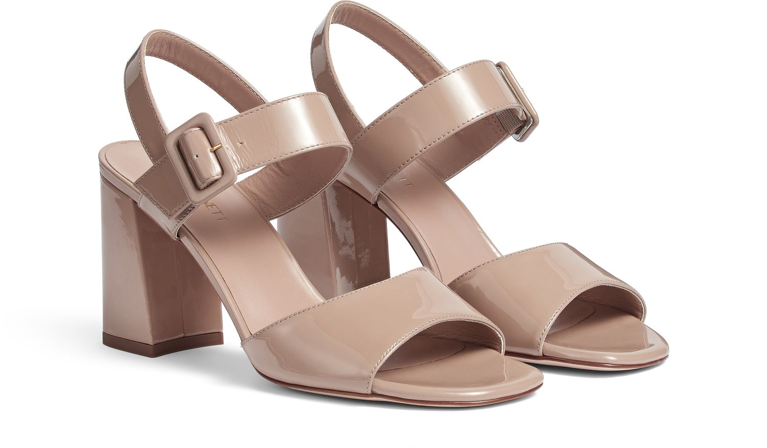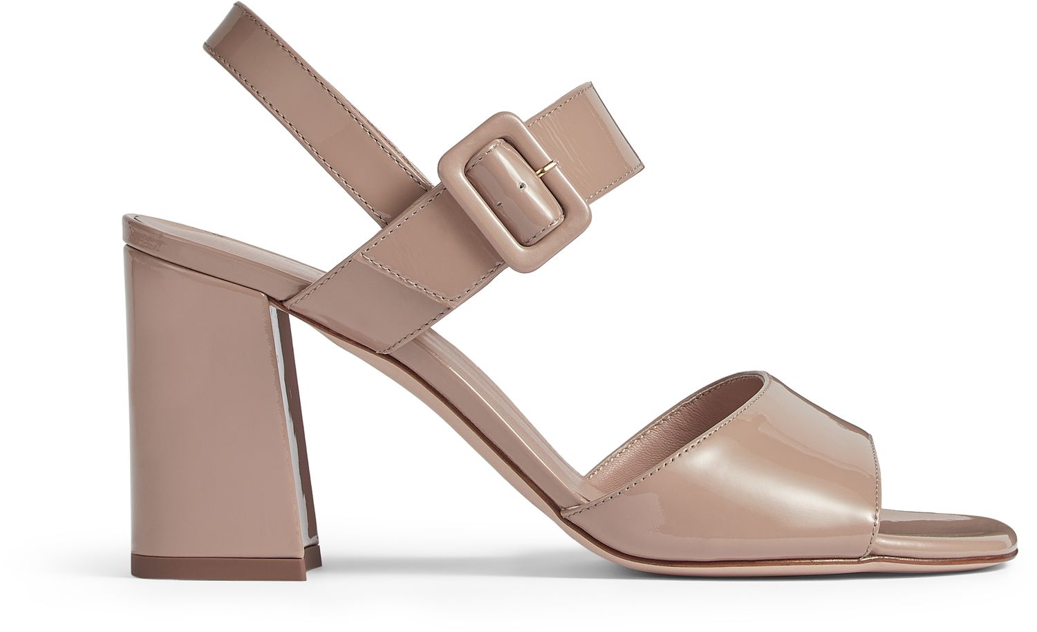 The Rae sandals are crafted in Spain from glossy patent leather in beige. They have a wide curved strap over the toes, a strap around the ankle with a large matching buckle and a chunky block heel.