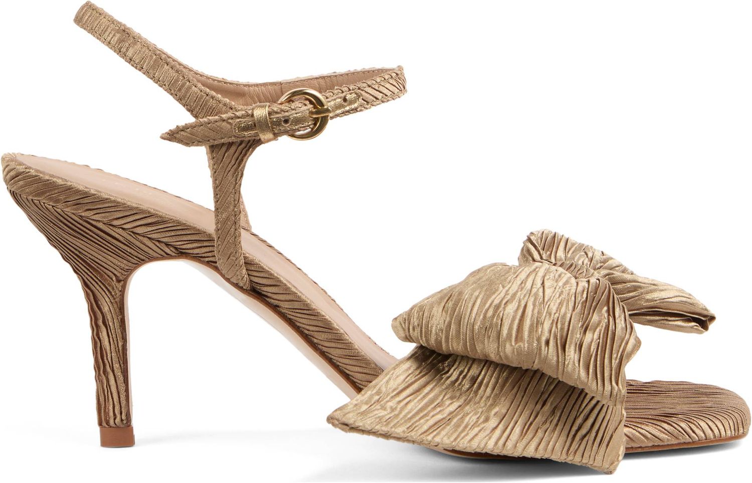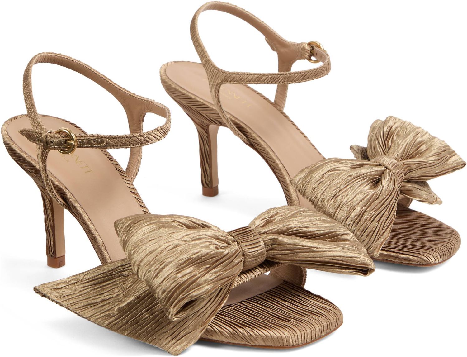 The Roline oversized plisse bow sandals in gold feature a stunning finish with elegant textured detailing. Crafted in Spain, these formal sandals with their statement bow design are perfect for special occasions.