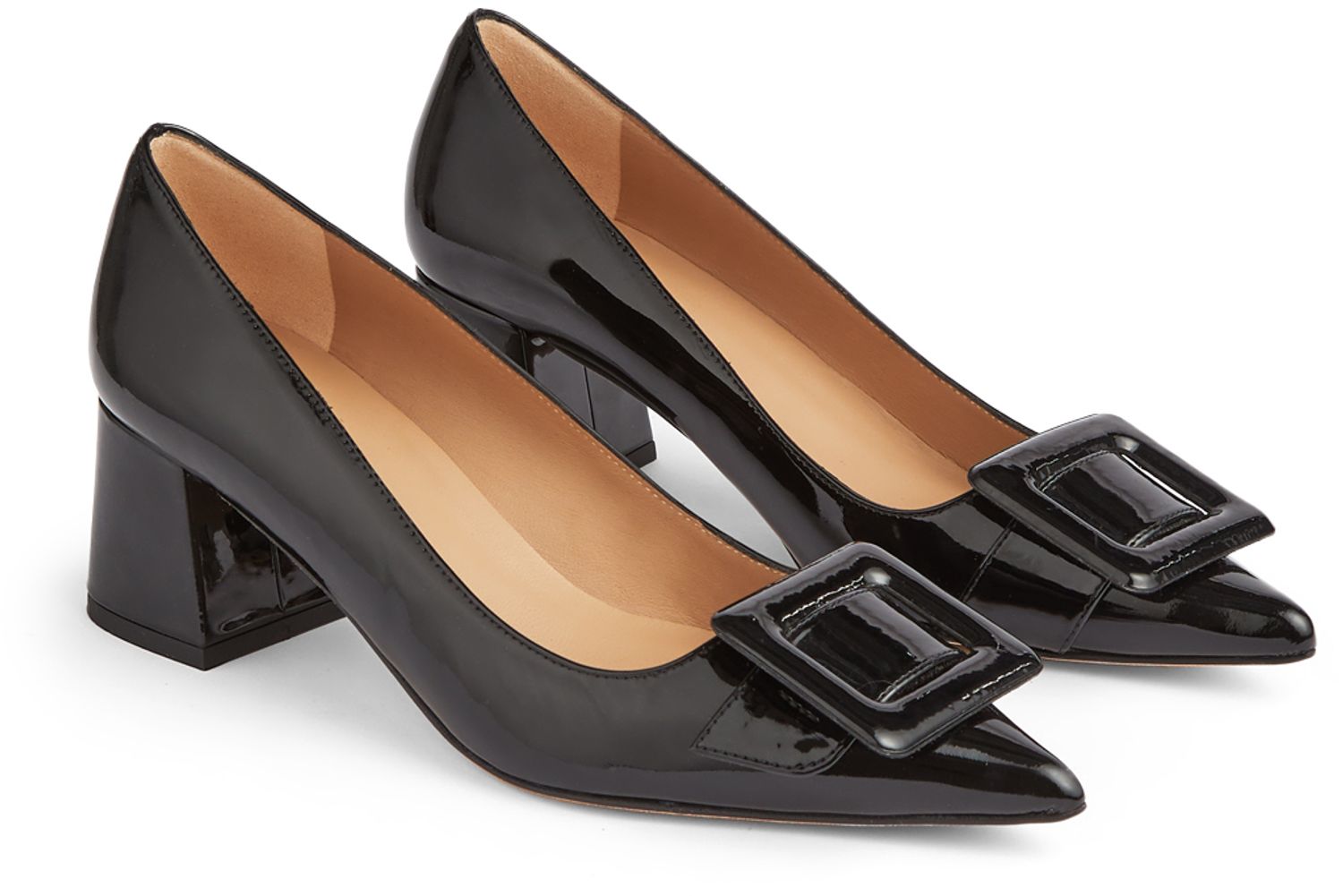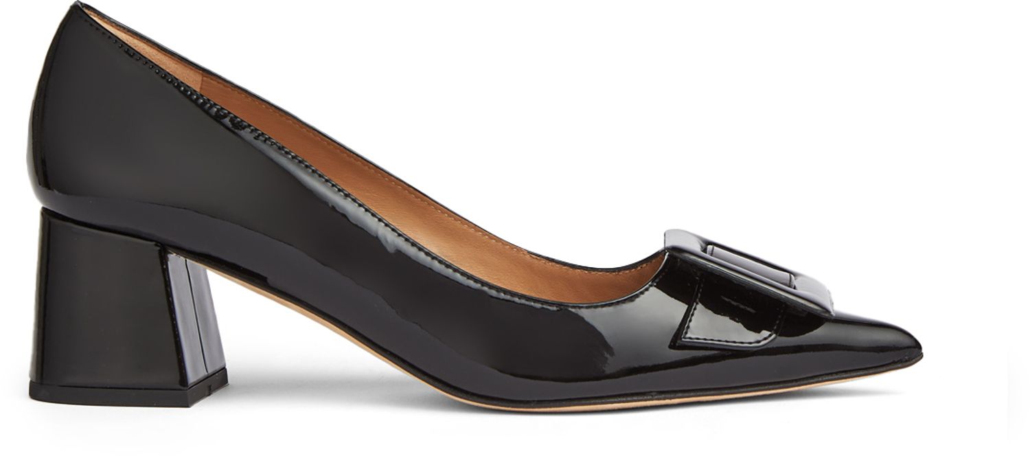 The Tia courts are crafted in Spain from black patent leather. They have a very pointy toe, large square buckle detail across the front and a patent- wrapped 55mm block heel.