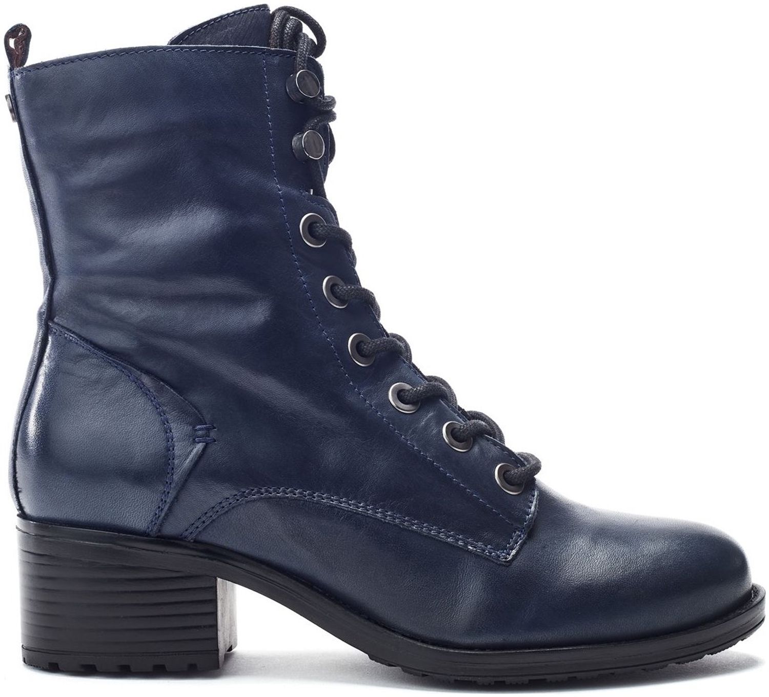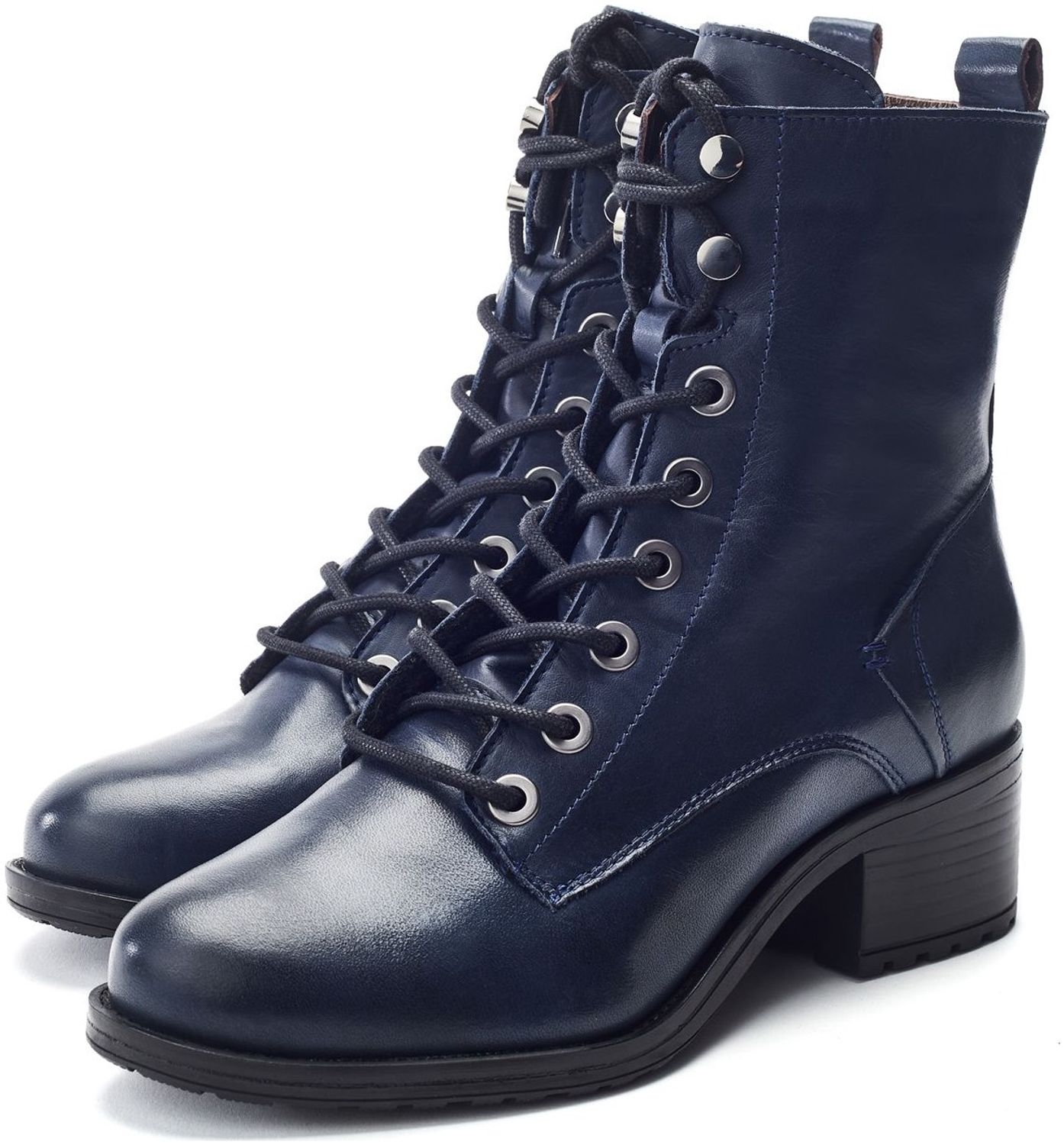 - Soft navy leather upper with subtle burnishing on the toe and heel for a vintage look