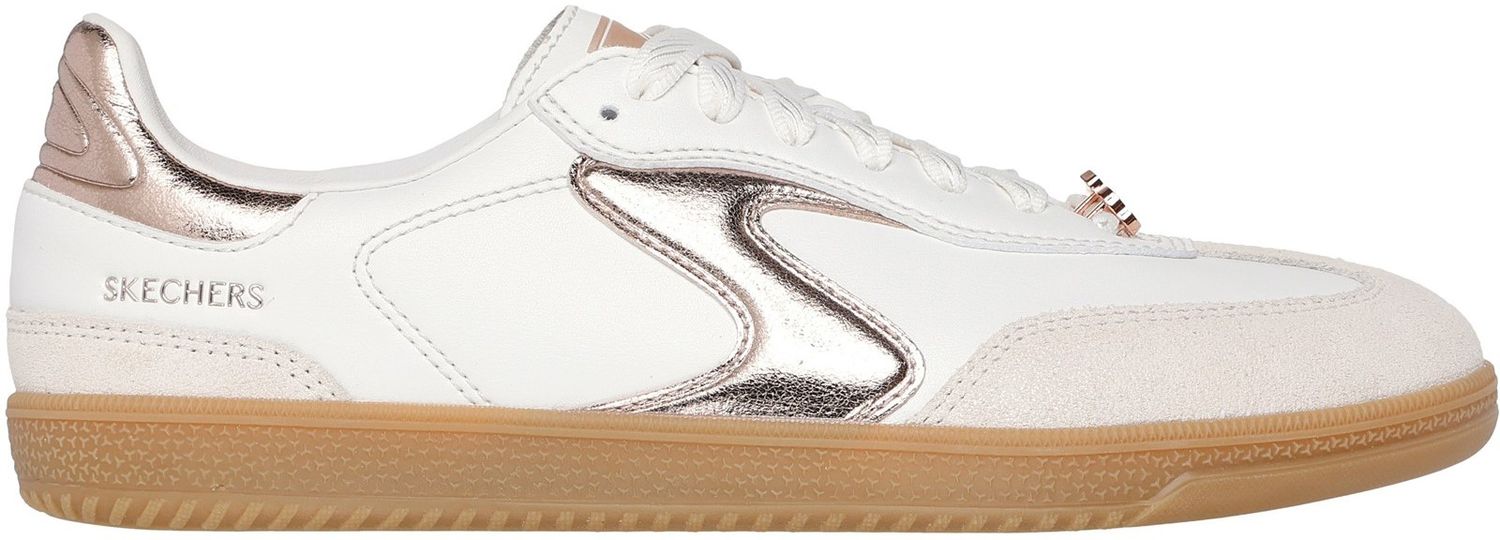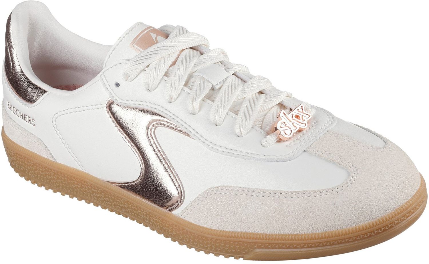 A modern classic meets fresh comfort in Skechers Hotshot - Cool Glow. This lace-up court-style sneaker features a duraleather upper with faux suede overlays, metallic color pop detail, and a cushioned Skechers Air-Cooled Memory Foam insole.