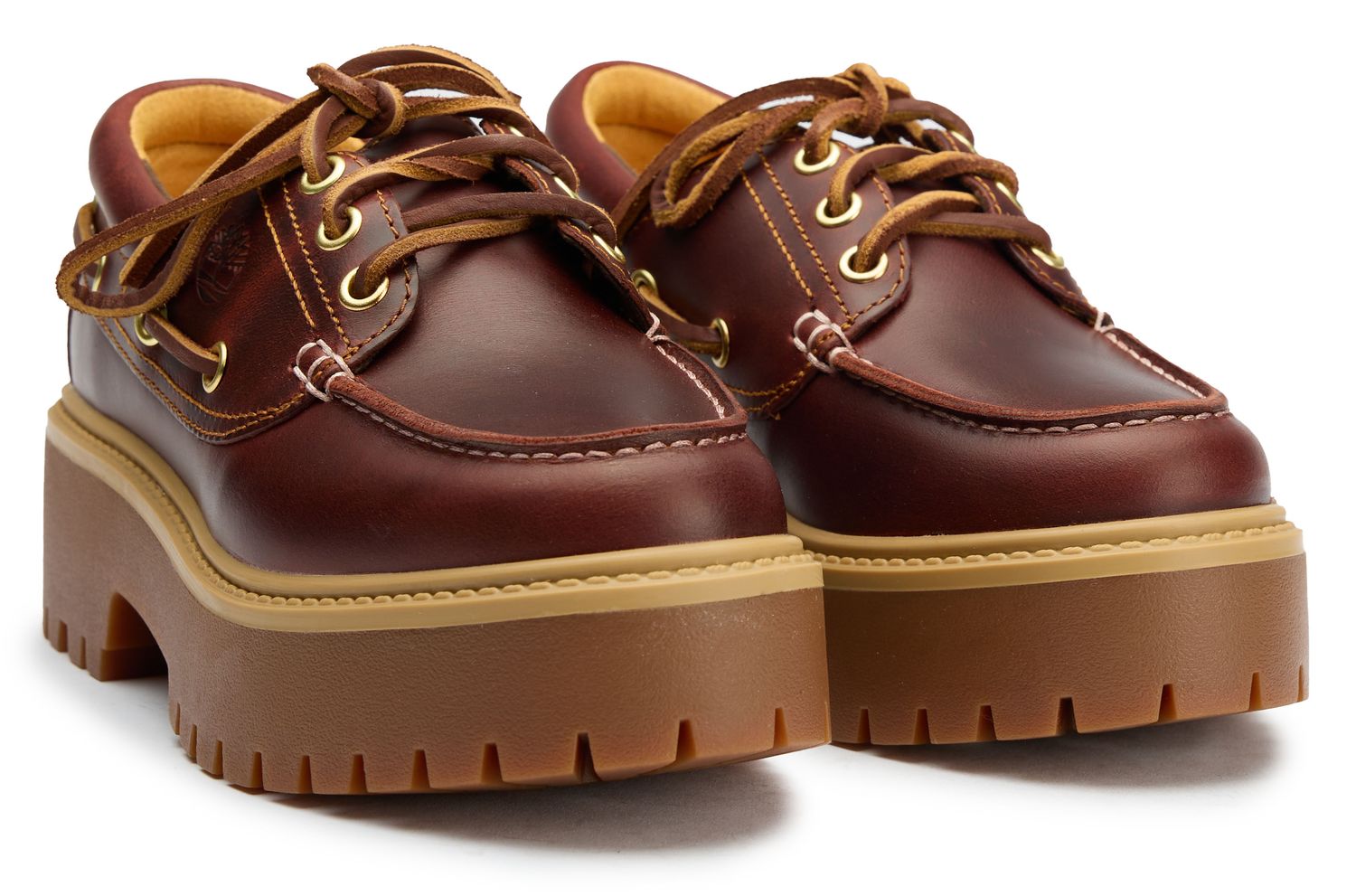 These rich brown leather boat shoes bring Timberland's rugged craftsmanship to waterfront style with a modern twist. The platform rubber sole adds height and comfort while maintaining that classic stitched apron detail boat shoe enthusiasts love. Soft leather lining and matching laces complete the premium feel, making these versatile enough for dockside adventures or city strolls. A sophisticated take on nautical tradition.