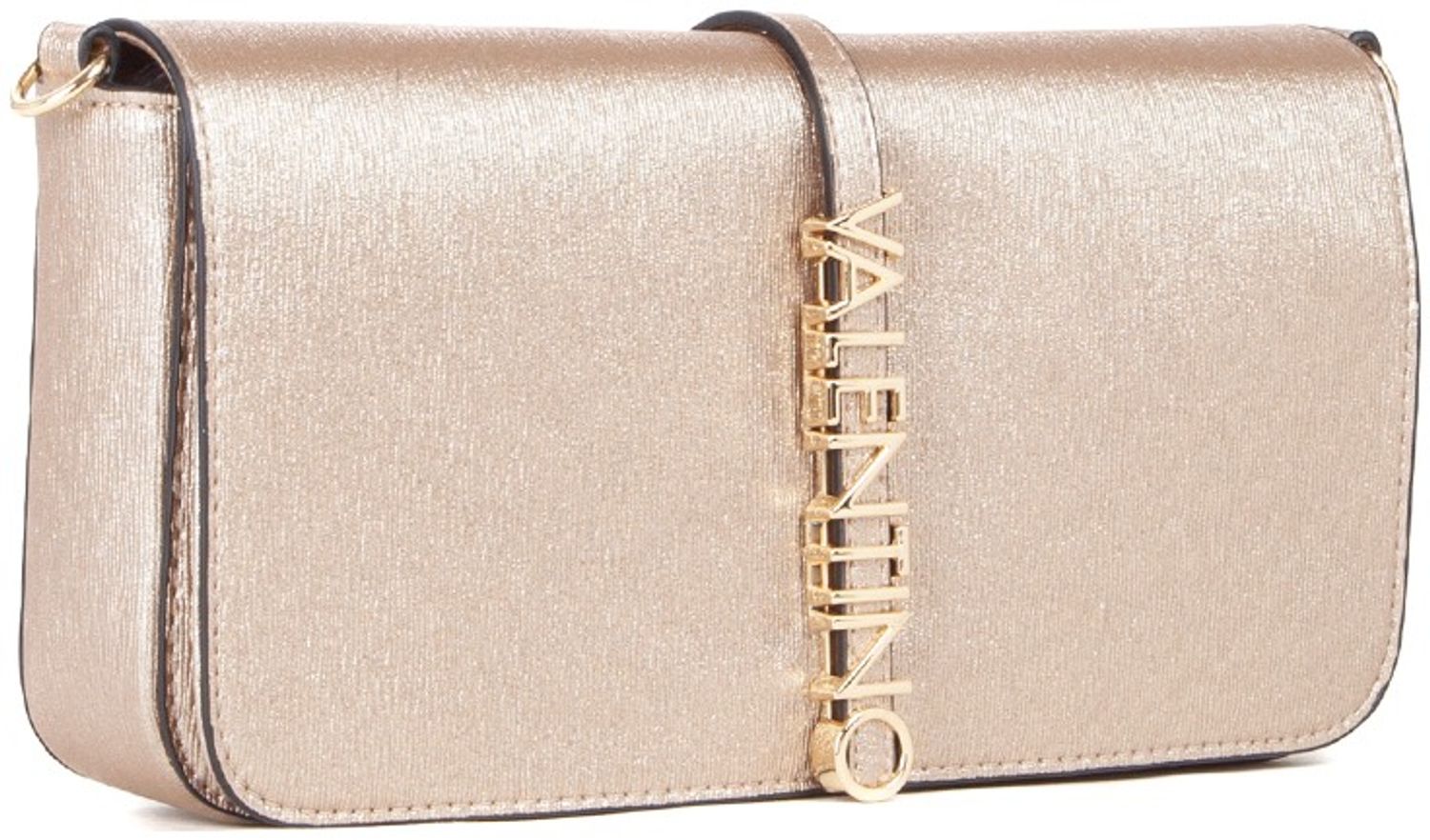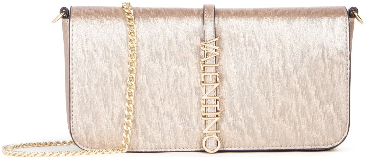 This gleaming Valentino Materia cross-body bag captures luxury in compact form. Crafted with a lustrous gold finish, it features a sophisticated chain shoulder strap that transitions effortlessly from day to evening wear. The secure popper closure opens to reveal thoughtfully designed internal compartments, perfect for organizing essentials. At 25cm wide, this sleek accessory delivers Valentino's signature elegance in a perfectly proportioned silhouette.